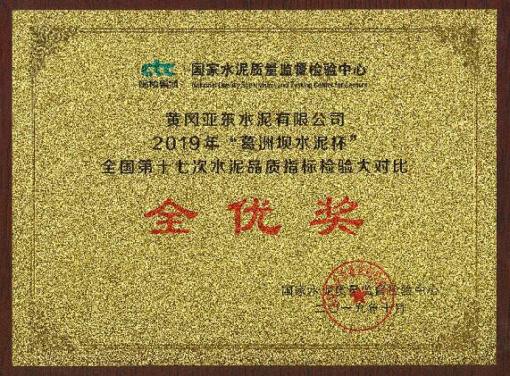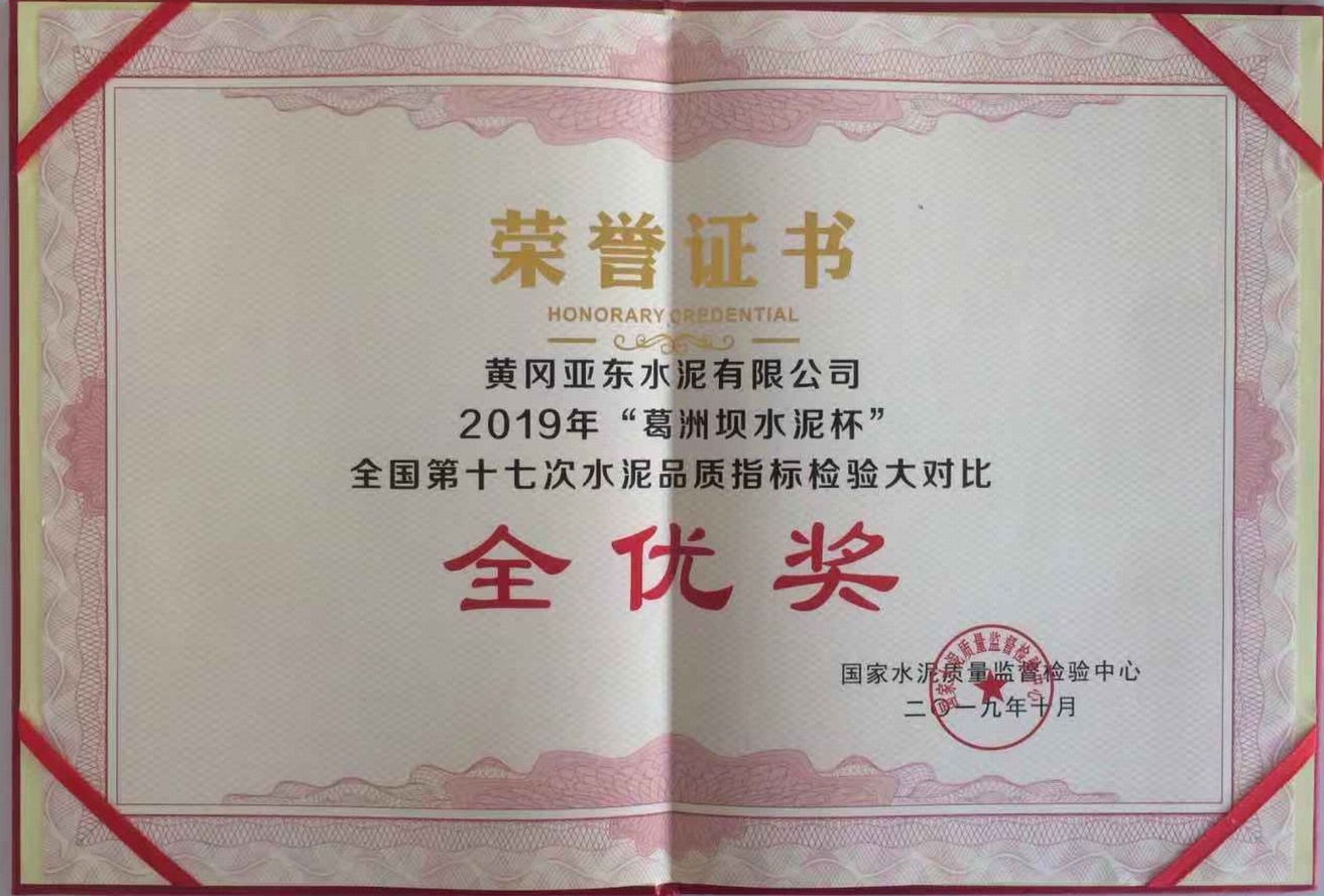 黄冈亚东荣获2019年 “葛洲坝水泥杯”全国第十七次水泥品质指标检验大对比「全优奖」