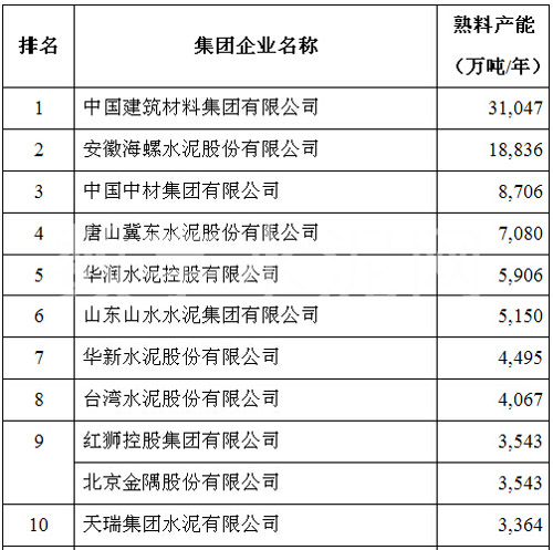 在2015’中国国际水泥峰会上,中国水泥协会公布了2015年全国水泥熟料产能前50家企业排名,中国建材以3.1亿吨的年熟料产能位居榜首,海螺水泥、中材集团分别以1.88亿吨和8706万吨的年熟料产能位列第二和第三,亚泥(中国)位列第十二位。